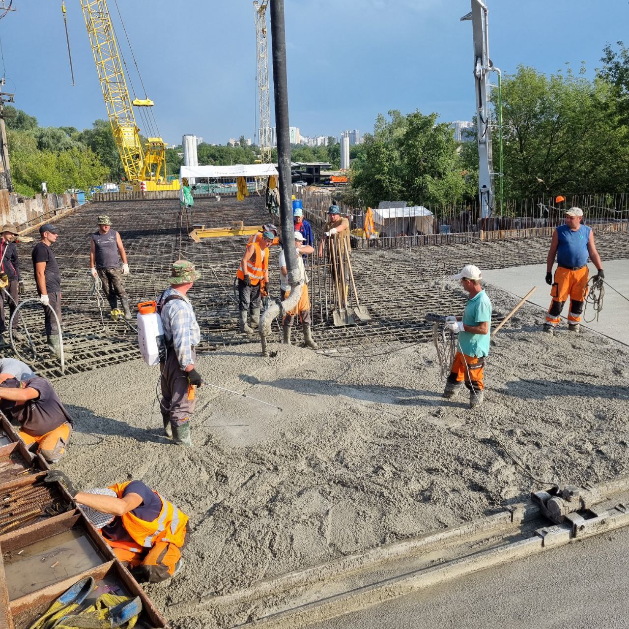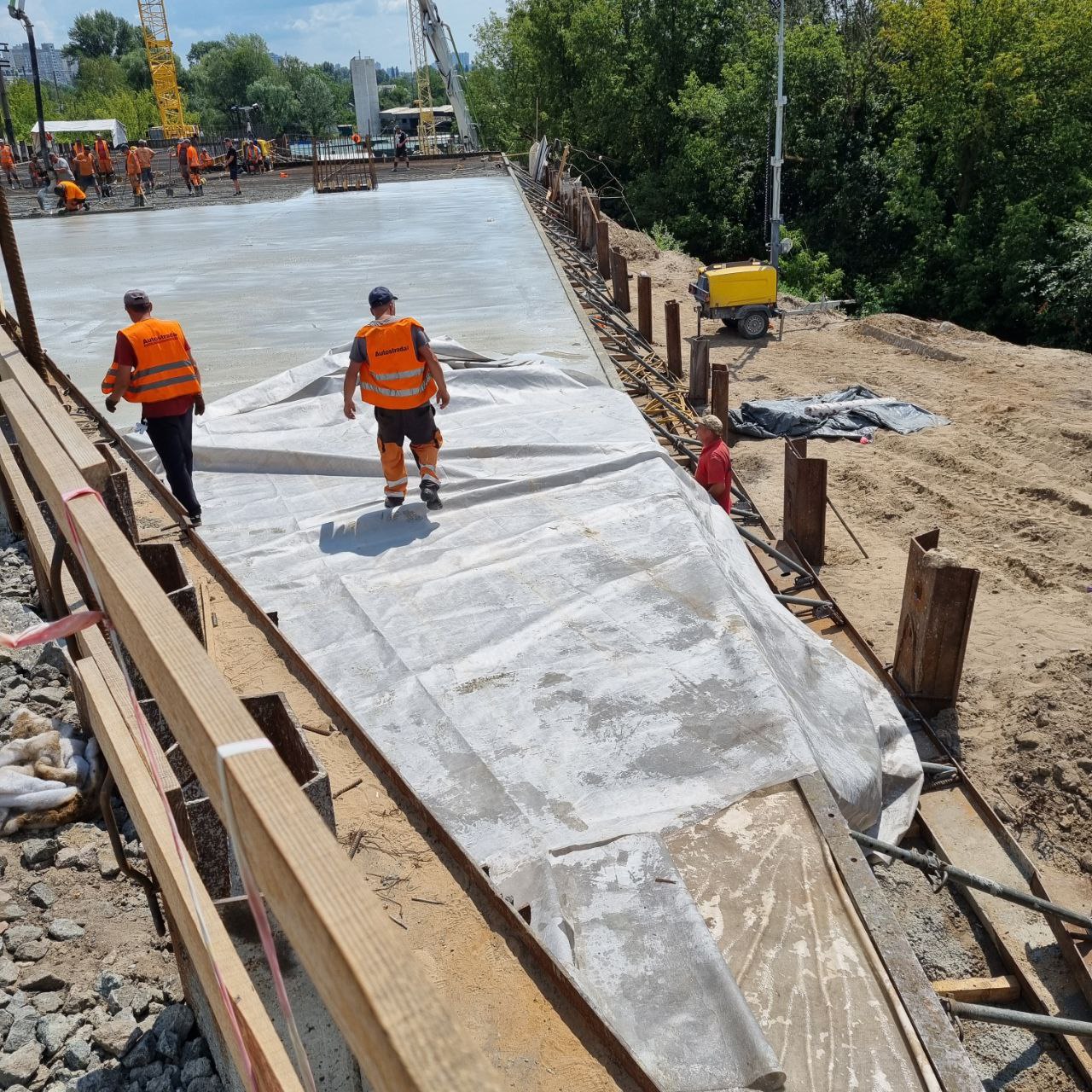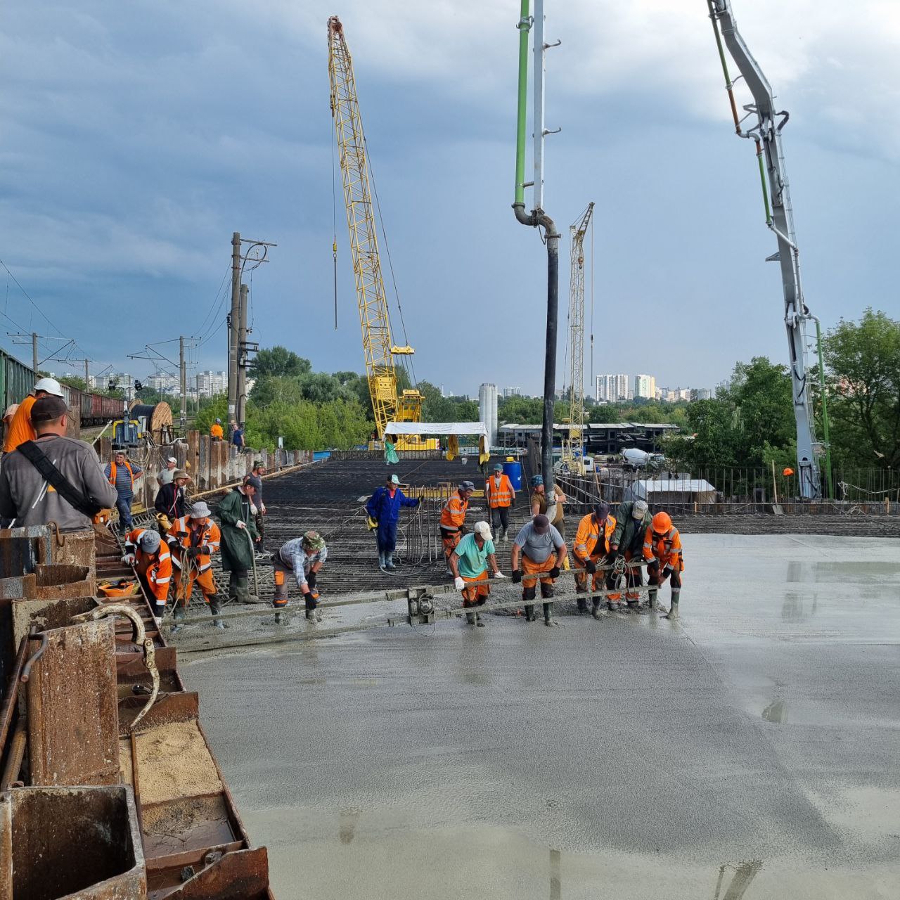 Попередньо 15 серпня на ній вже мають відновити залізничну колію, після чого підрядник ГК "АВТОСТРАДА" розпочинає підготовку до бетонування другої половини плити з боку Воскресенських садів. В огляді Ви побачите процес бетонування. В моноліті використовується бетон високої марки, завдяки чому необхідна міцність отримується в більш короткий термін. Крім того протягом певного часу не планується прибирати з під плити підтримуючі силові конструкції в якості додаткової страховки.