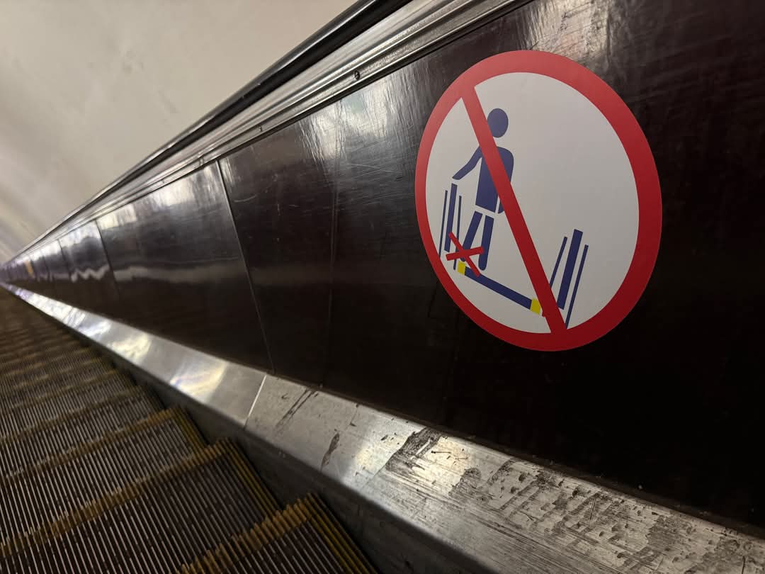 На нижніх боковинах балюстради доречно залишити лише наліпки про заборону сидіння для людей сидячих. Все інше там - невидимо для гомо еректусів. І виникає питання, чи хтось тестував в реальному режимі наповненості ескалаторів видимість цих наліпок. Бо зараз виглядає це як просто дерибан.