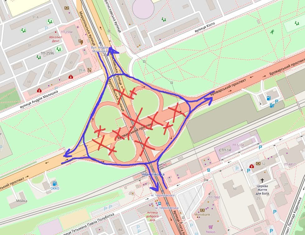 Попалась в комментариях такая схема. Автора назвать не смогу.KharkivSky писал(а): ↑05 апр 2026, 14:01Пишут, что с 25 апреля закроют прямые проезды по путепроводу и под ним и организуют движение по кругу.