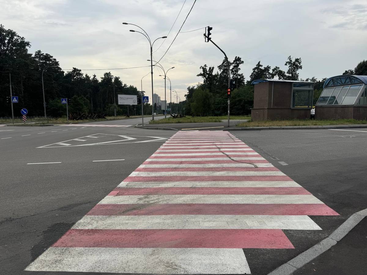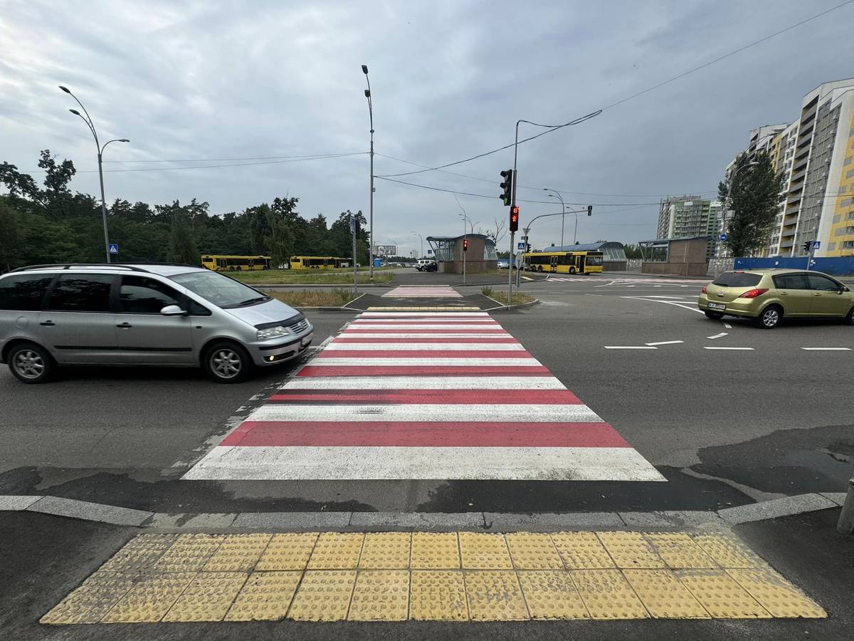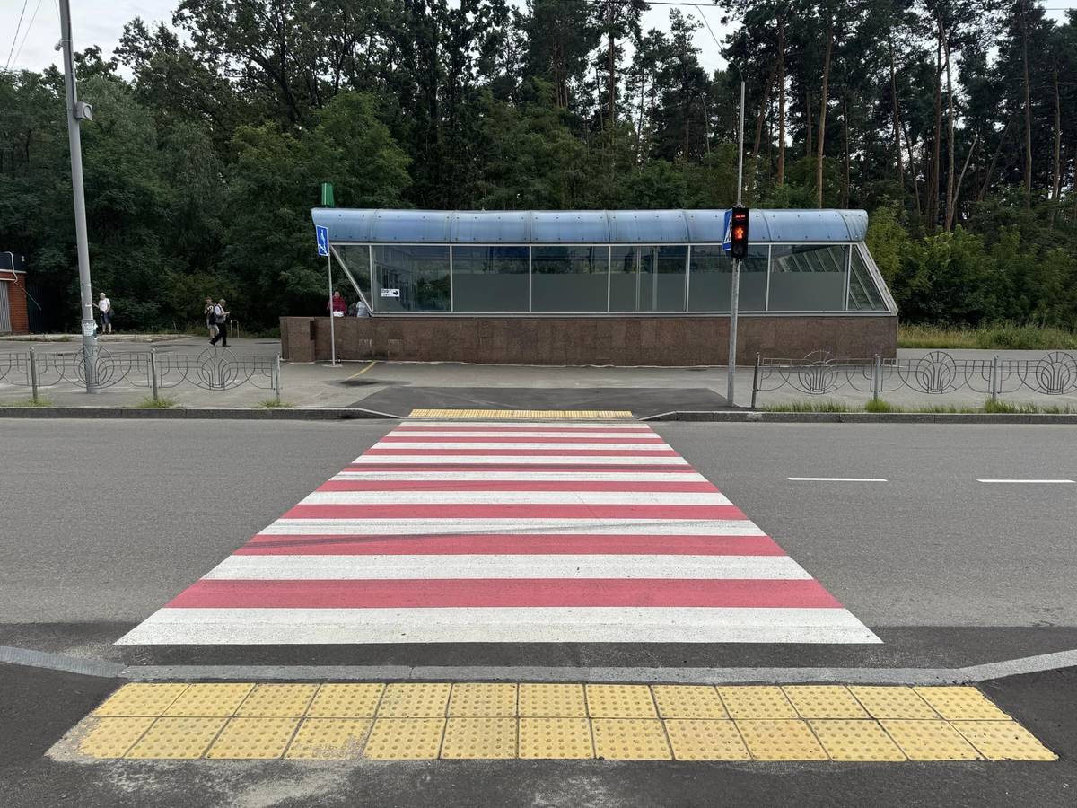 В районі виходів зі станції метро "Червоний хутір" облаштували наземні пішохідні переходи зі світлофором.