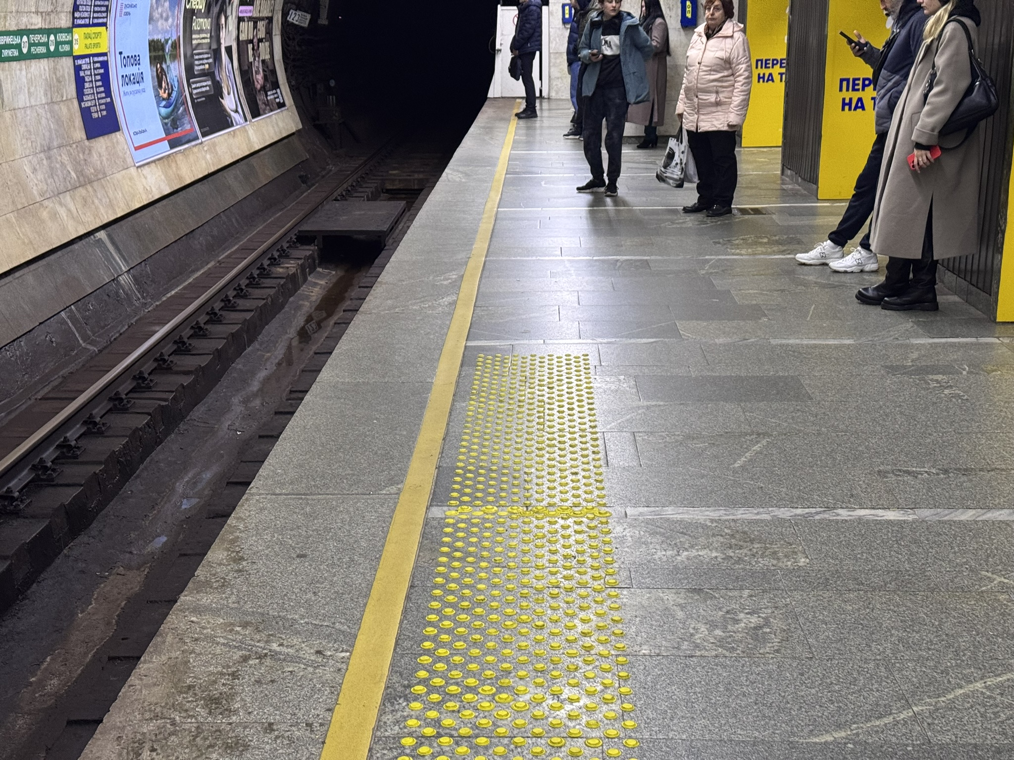 Як переконувала мене людина з ГО, де свято вірять в те, що все робить КМ - все правильно, оце зроблено, щоб люди не підходили близько до жовтої обмежувальної лінії, бо стояти на цих "цвяхах" не дуже зручно. Це дійсно так, стояти на цих некомфортно. Саме через це... люди заходять за жовту лінію))
