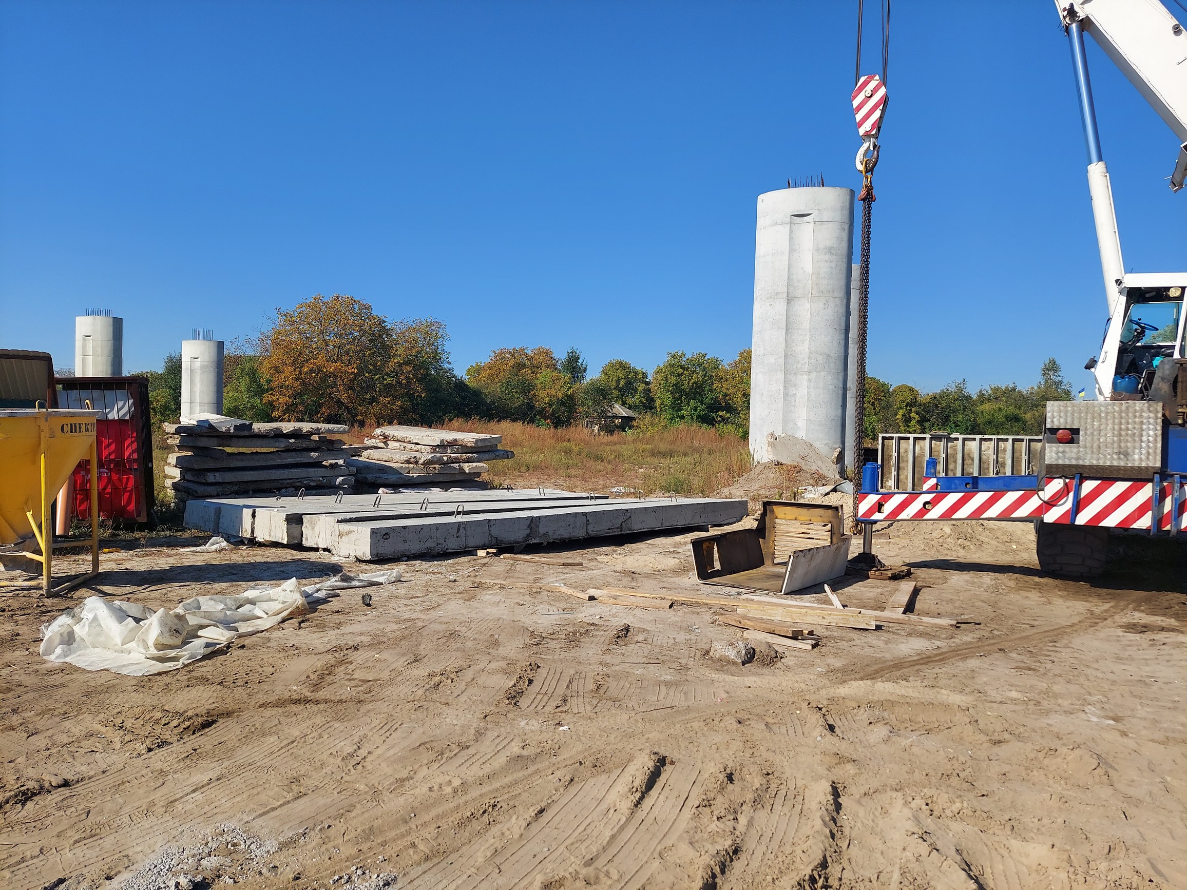 Станом на кінець вересня на Подільсько-Воскресенському мості тривають роботи з монтажу деформаційних швів та влаштування гідроізоляції і покриття проїзної частични прогнонових будов по всій трасі переправи.