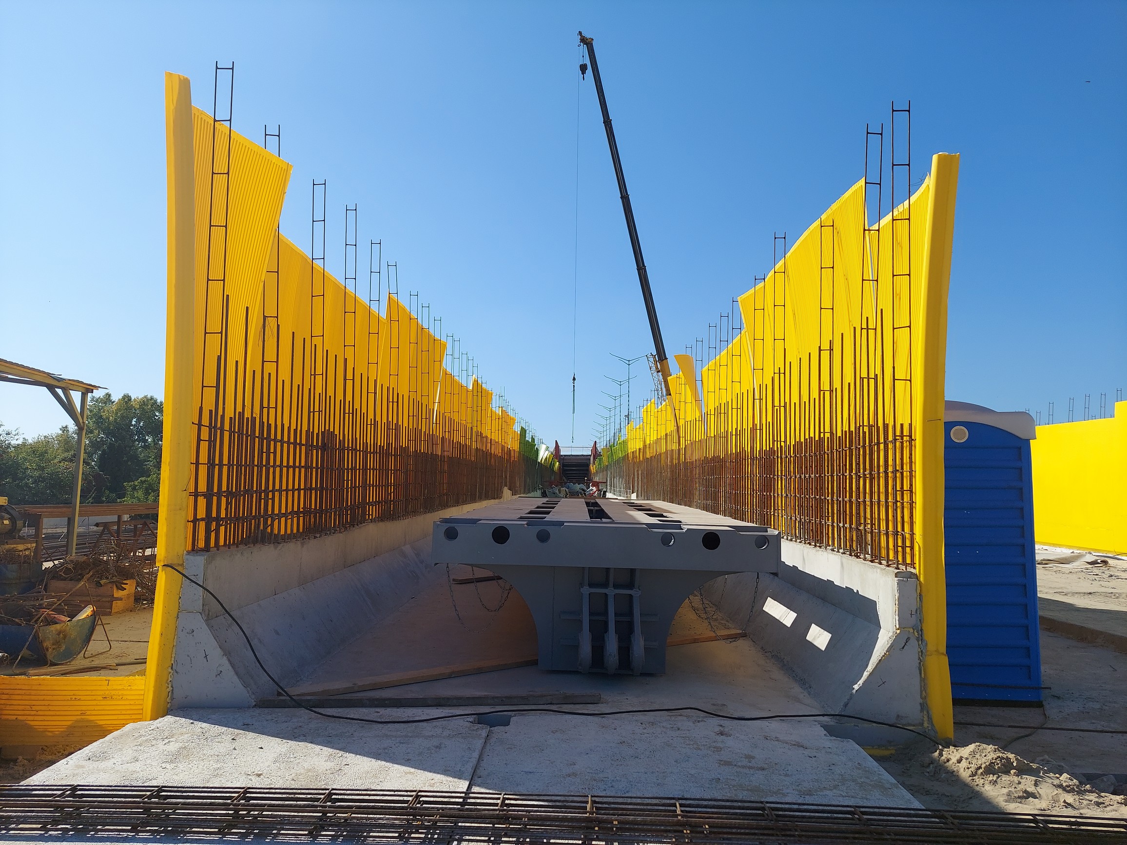 На самій переправі в повному обсязі завершили роботи з натяжіння та регулювання вантових канатів аркового мосту, зняли навантаження від балки жорсткості на тимчасові монтажні опори. Прогонова будова на сьогодні підвішена на вантах до арки та перебуває в проєктному положенні. Тимчасові опори надводної частини вже демонтували.