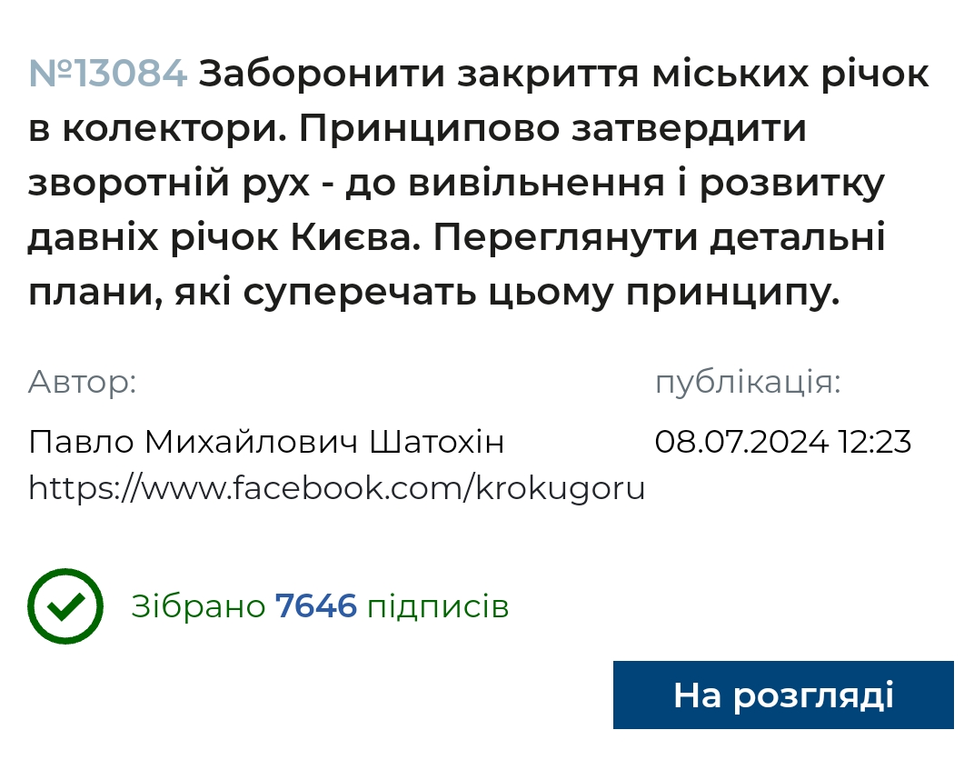 Петиція до Київради № 13084 проти закриття міських річок у колектори зібрала необхідні шість тисяч голосів за два дні.